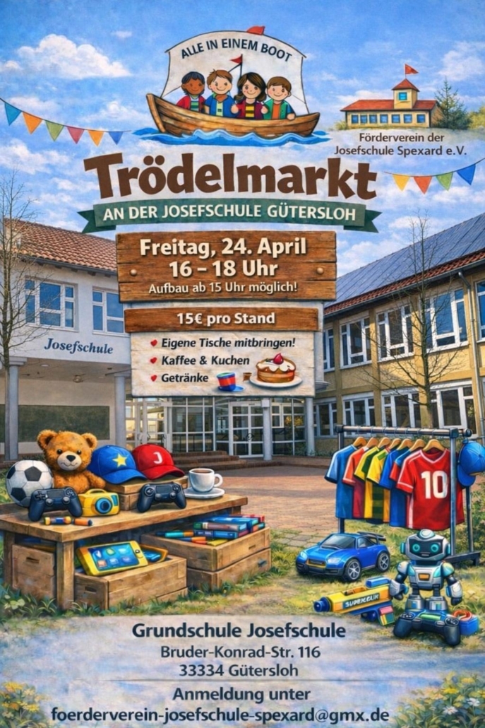 es ist mal wieder soweit! Wir laden Sie und euch herzlich zu unserem gemütlichen Trödelmarkt auf dem Gelände der Josefschule ein. Ob Spielzeug, Kleidung oder kleine Schätze – hier findet alles ein neues Zuhause.