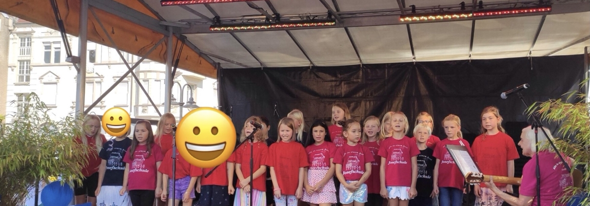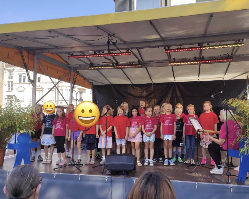Schon eine Tradition ist der Auftritt der Josefschulkids bei den Feierlichkeiten zum Weltkindertag in Gütersloh. Vor der Martin- Luther-Kirche sind einige Stände, eine Hüpfburg und eine große Bühne aufgebaut. Die Rechte der Kinder werden an diesem Tag gefeiert. Und passend zu dem Thema haben einige Josefschulkids Lieder präsentiert.
